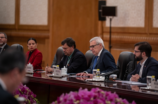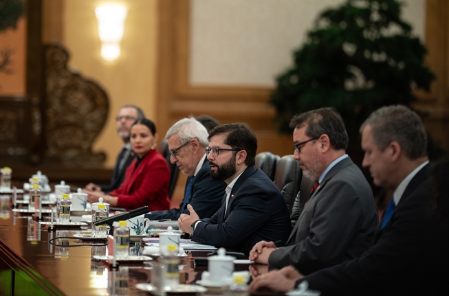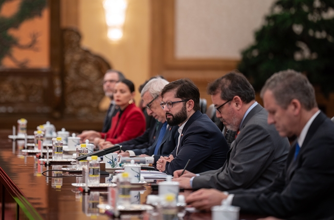 Este miércoles 14 de mayo, el Presidente de la República, Gabriel Boric Font, sostuvo una reunión bilateral con el Presidente de la República Popular China, Xi Jinping, acompañado de los ministros de Relaciones Exteriores, Alberto van Klaveren; Agricultura, Esteban Valenzuela; Transportes y Telecomunicaciones, Juan Carlos Muñoz; la ministra de las Culturas, las Artes y el Patrimonio, Carolina Arredondo; el embajador de Chile en China, Pablo Arriarán; la directora de InvestChile, Karla Flores; y el director general de ProChile, Ignacio Fernández.