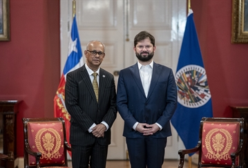 S.E. el Presidente de la República, Gabriel Boric Font, junto al ministro de Relaciones Exteriores, Alberto van Klaveren, recibe en audiencia al Secretario General de la Organización de Estados Americanos (OEA), Albert R. Ramdin.